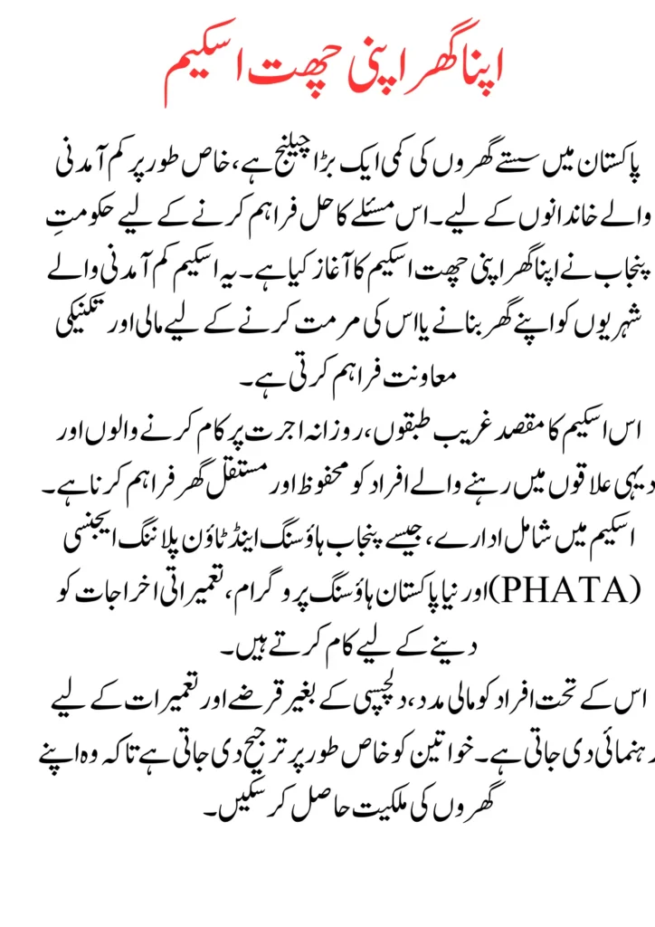 The Apna Ghar Apni Chhat Scheme focuses on helping low-income families, daily wage earners, and rural communities construct safe and permanent homes. This initiative works with organizations like the Punjab Housing and Town Planning Agency (PHATA) and the Naya Pakistan Housing Programme to offer subsidies and support for construction costs.